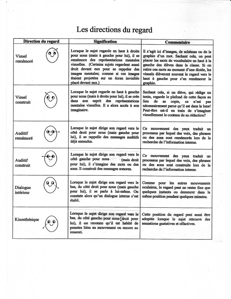 Les travaux de Bandler et Grinder leur ont permis d’observer que, lorsqu’une personne est en train de faire un effort mental, la direction de son regard révèle son processus de pensée. Il s’agit de mouvements involontaires et systématiques qui nous renseignent sur le système de représentation utilisé par un sujet. L’observation des mouvements oculaires permet de découvrir la stratégie inconsciente qu’il sollicite afin de repérer et d’organiser l’information. Sachant cela, il est possible d’intervenir de façon encore plus efficace auprès d’un élève. Le tableau ci-dessous permet de distinguer les différents mouvements oculaires et leur correspondance avec le travail de représentation mentale effectué par un sujet qui est face à nous. Il est à noter qu’il s’agit ici des mouvements oculaires standard d’une personne droitière; ce qui correspond à environ 80% de la population.